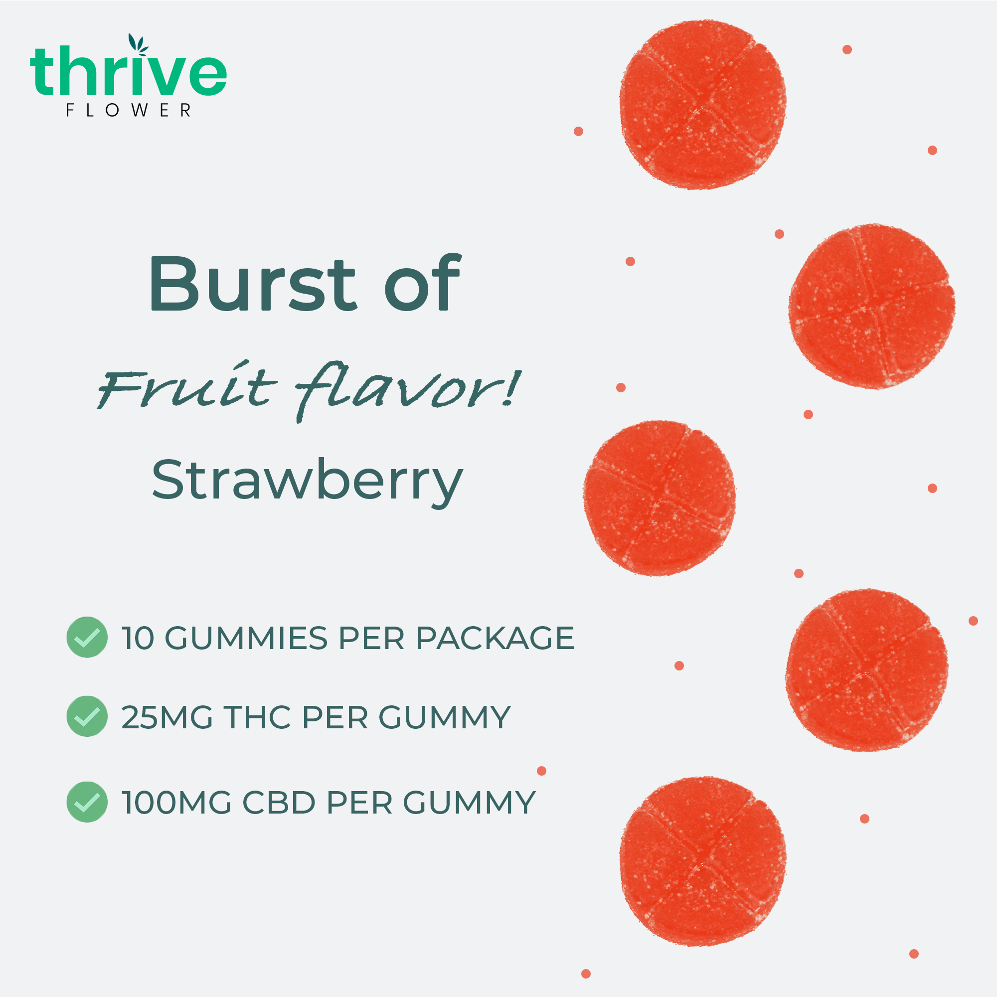 Enjoy the fine flavor of strawberry when you purchase a pack of Thrive Flower Delta 9 THC Gummies with 25mg of THC per gummy. There are 10 gummies in each pack. Each gummy contains 25mg of Delta-9 THC, 100mg of CBD, and 10mg of CBG. That is a total of 250mg Delta-9 THC, 1000mg CBD, and 100mg CBG Per jar of Thrive Flower Delta 9 THC Gummies.